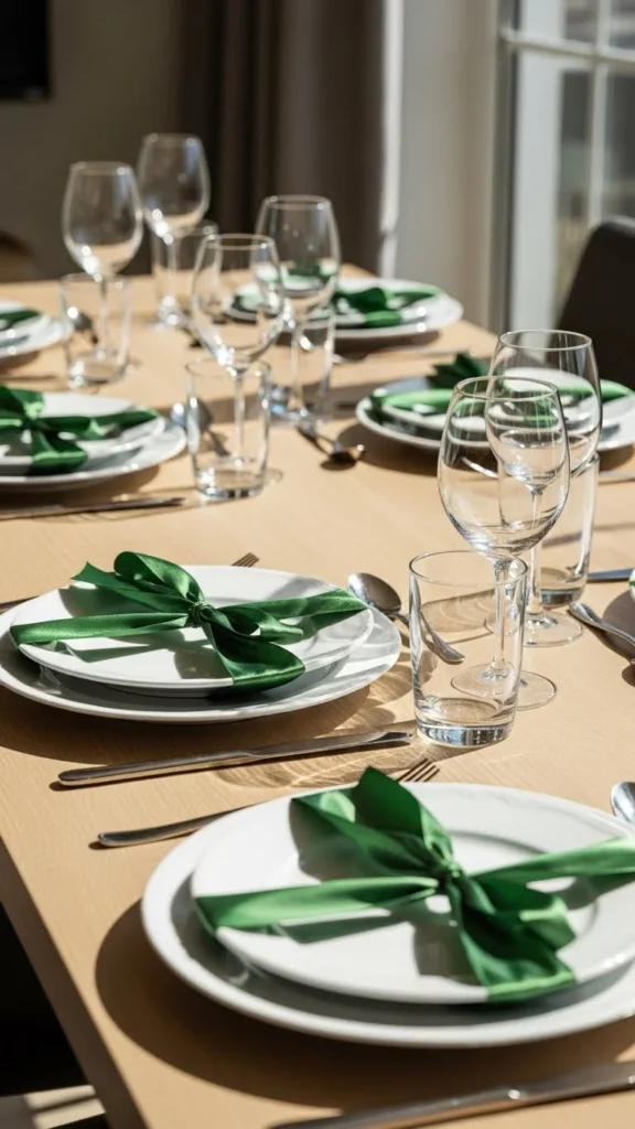 Tie green ribbon around folded napkins or plates. This adds color without extra items. Ribbon is affordable and easy to store. Keep bows simple so they do not overpower the table.