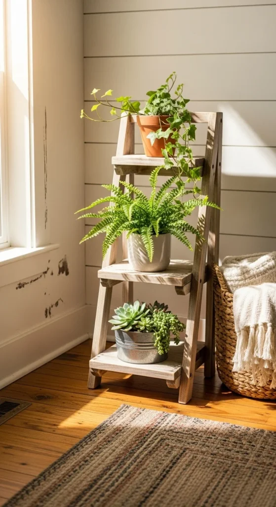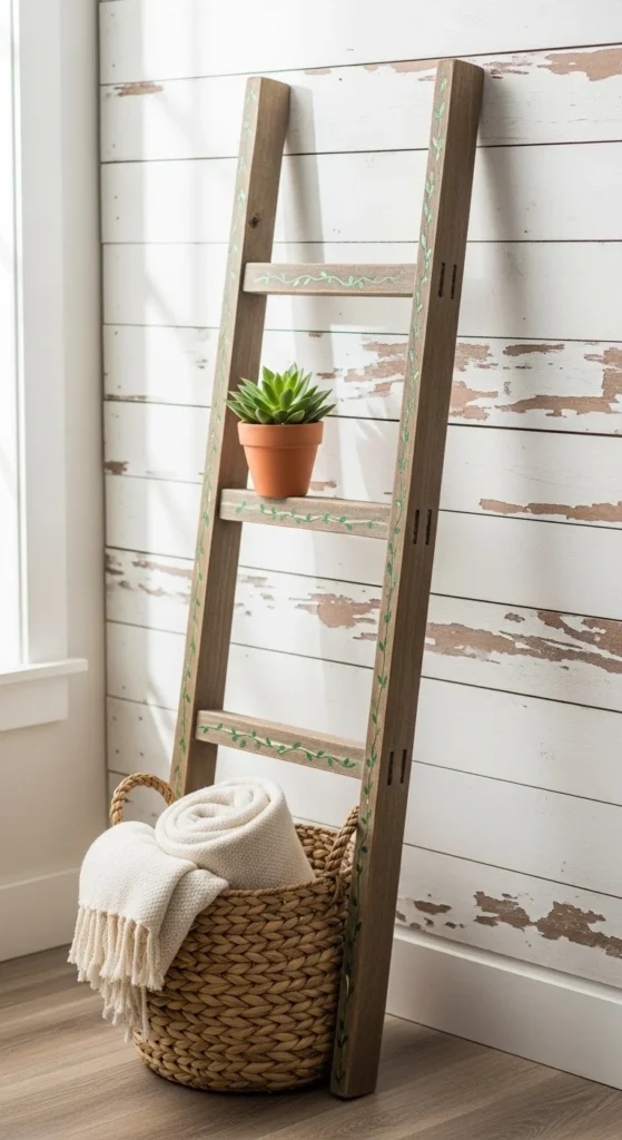 Build a mini ladder from dowels or scrap strips. Lean it against walls or shelves. Add greenery for a subtle holiday touch.