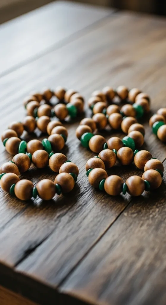 Create bead strands using unfinished wooden beads. Add a single painted bead for St Patrick’s Day. Drape on shelves or trays. This craft is low-cost and reusable for other seasons.