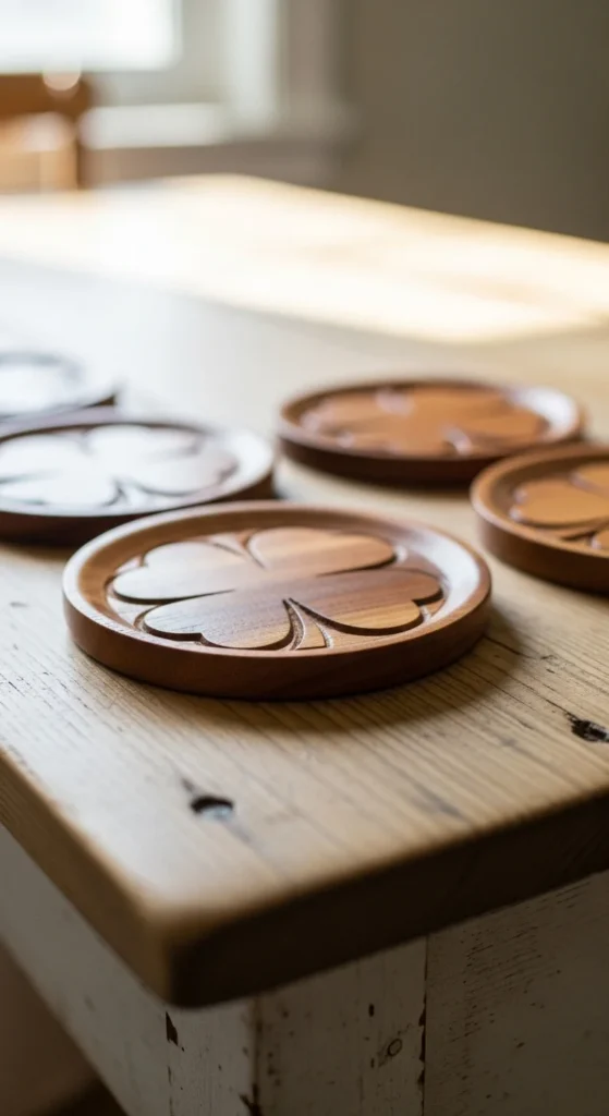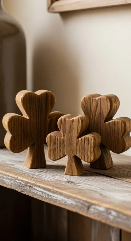 Cut thick clover shapes from wood blocks. Sand edges smooth but uneven. Paint softly or leave raw. These sit nicely on shelves and mantels. Their weight helps them stay upright without stands.
