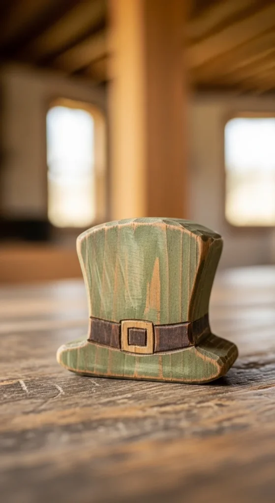 Turn scrap wood into a simple leprechaun hat block. Stack two rectangles and glue together. Paint lightly using muted green and black tones. Sand edges to soften the finish. This craft fits well on tiered trays or bookshelves. It’s small, quick, and reusable. Because the shape is simple, it pairs well with neutral decor and doesn’t overpower a space.